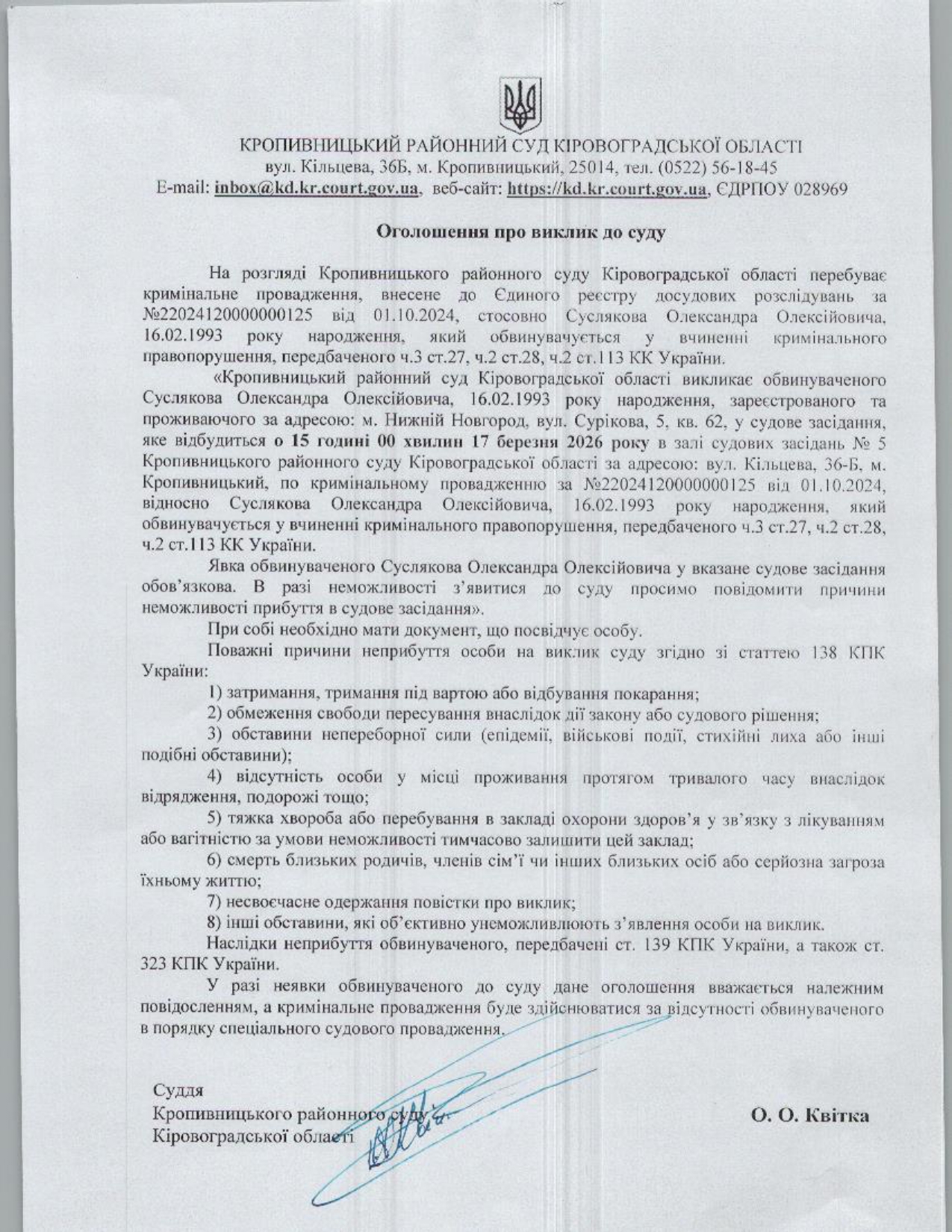Увага! Виклик до суду Суслякова Олександра Олексійовича